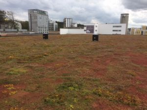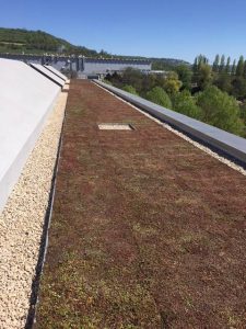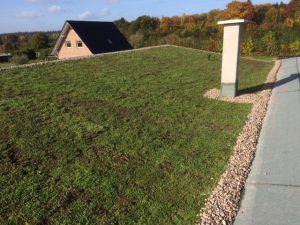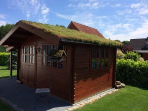 Gartenhaus mit pflegeleichtem Sedum-Moosdach, Ausführung 2013 Flachdach eines modernen Einfamilienhauses mit pflegeleichter Dachbegrünung mit Sedum-Moosmatte, Dünsen 2016 Einkaufscentrum Aalborg mit Sedum-Moosdach, ca. 2000 m², Ausfürhung 2014 Hanghaus mit Sedum-Moosmatte als Dachbegrünung, Ausführung 2014 Gleisbettbegrünung mit Sedum-Moosmatte